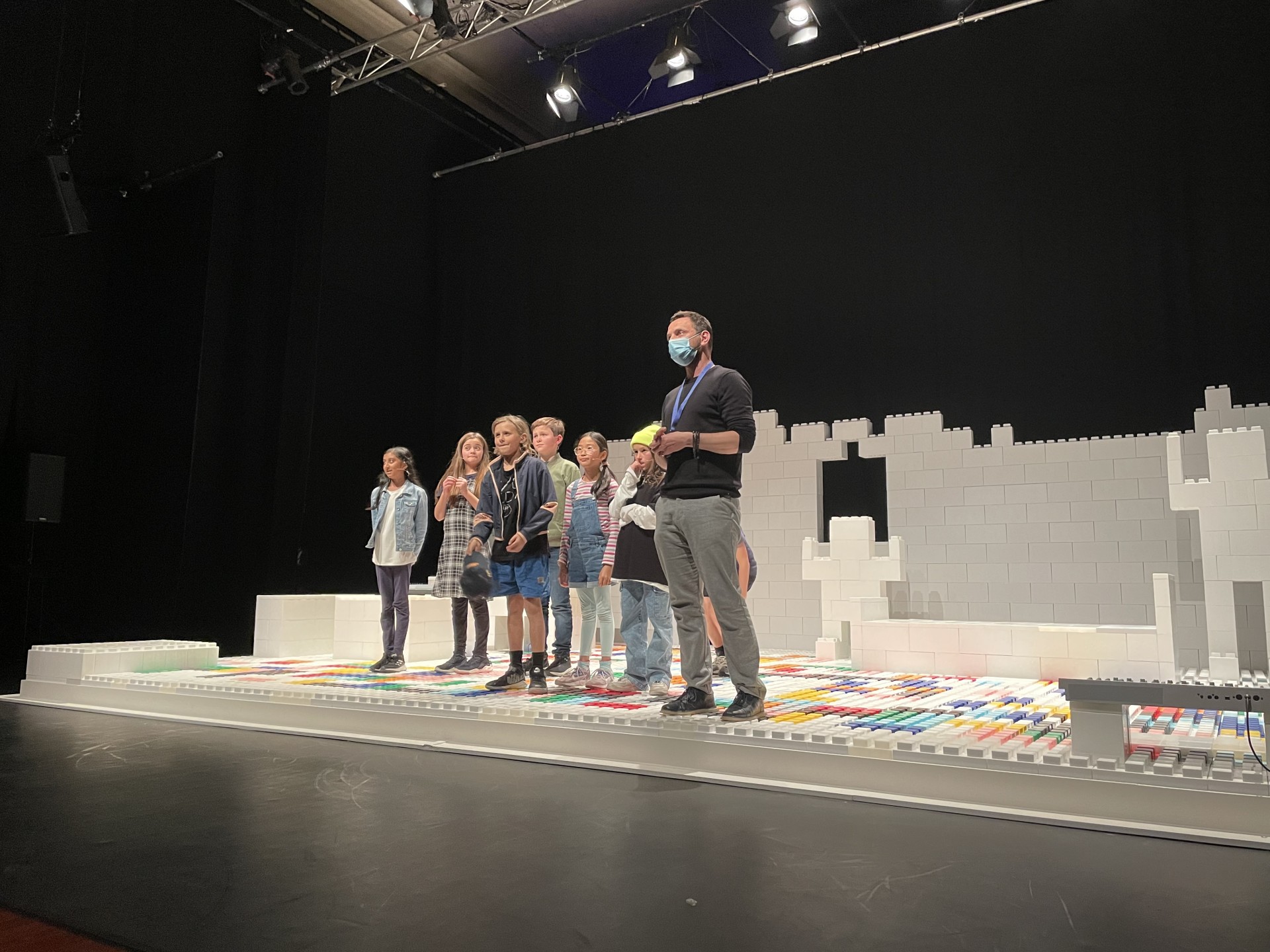 Image Description: 6 children are on stage, standing on a structure that resembles lego pieces. In front of them are two people using computers as they watch the work.