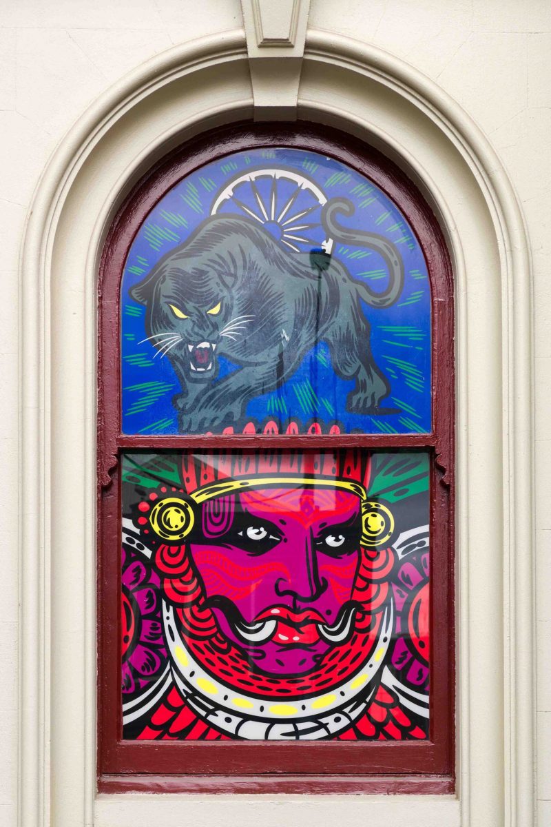 In this window commission, Siva delves into the themes of hybridity, fluidity, affirmations and rest. Through the lens of speculative fiction, the imagery of lizards and Millet grass evoke concepts of regrowth and the cycles of nature.