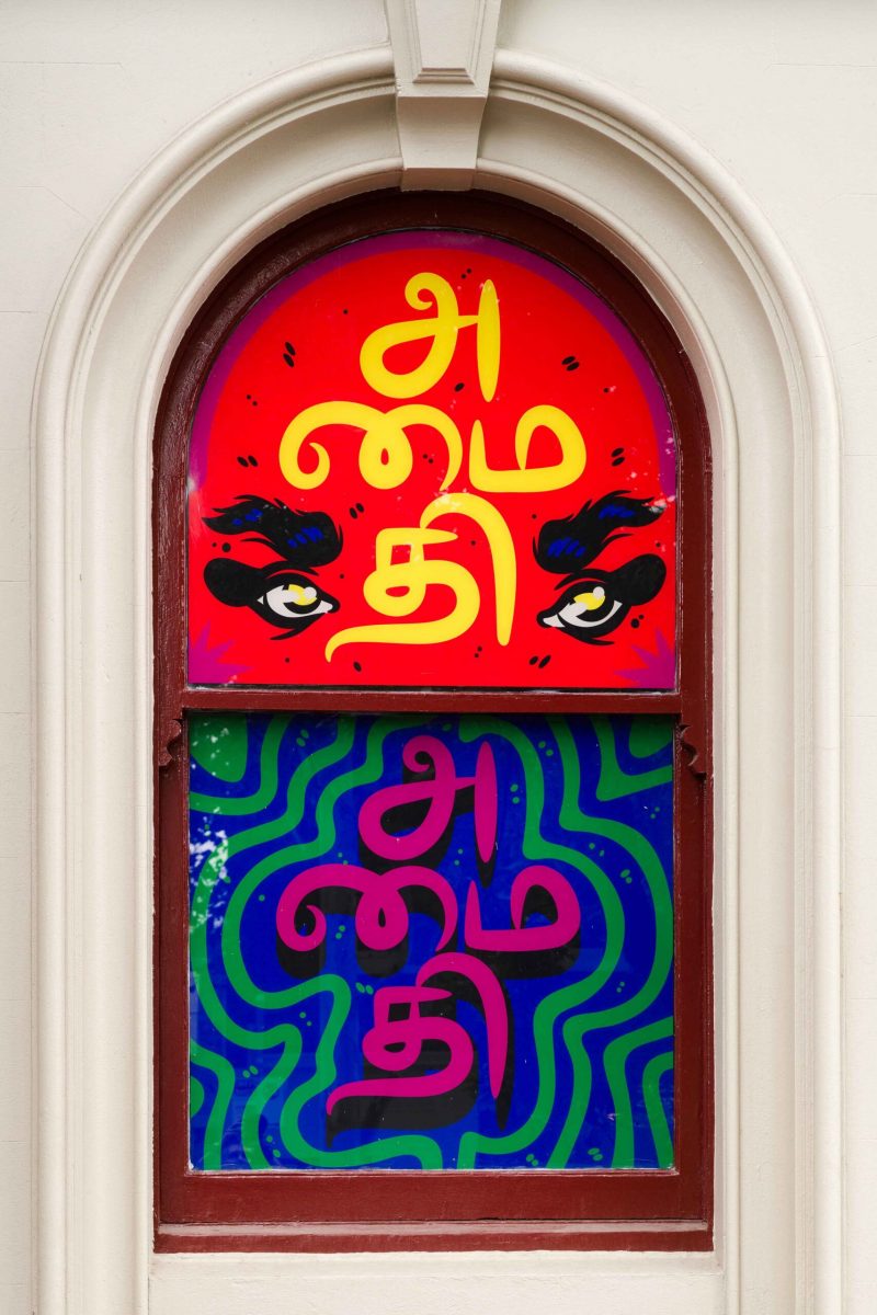 Central to the work are the Tamil texts, notably அமைதி Amaithy which evokes a sense of serenity, tranquillity and harmony.